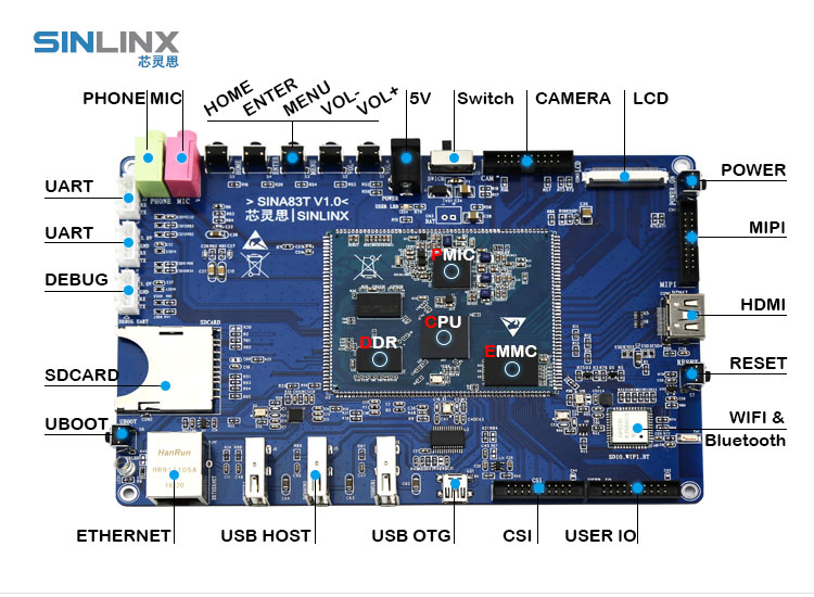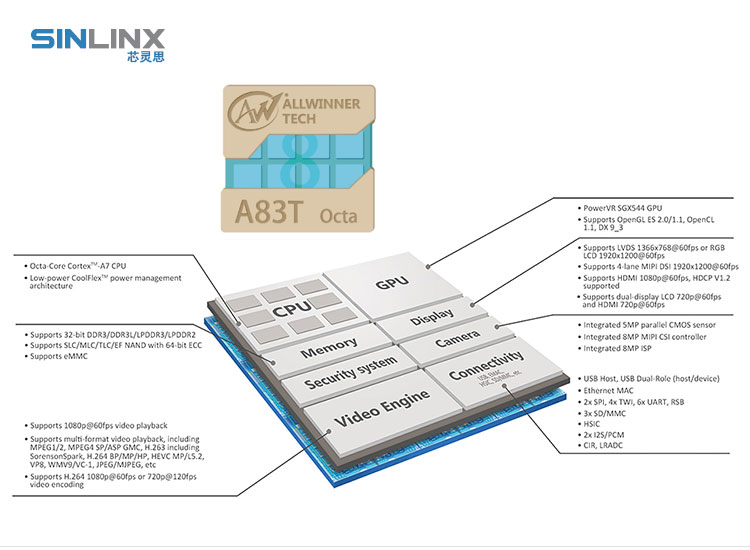 SIN-A83T 8 * Cortex-A7、1GB DDR3、8GB EMMCPoverVR SGX544 GPUAndroid5.1、Linux3.4+QT4.8.7 SDK BOARD SIN-A83T 8 * Cortex-A7、1GB DDR3、8GB EMMCPoverVR SGX544 GPUAndroid5.1、Linux3.4+QT4.8.7 CPU BOARD